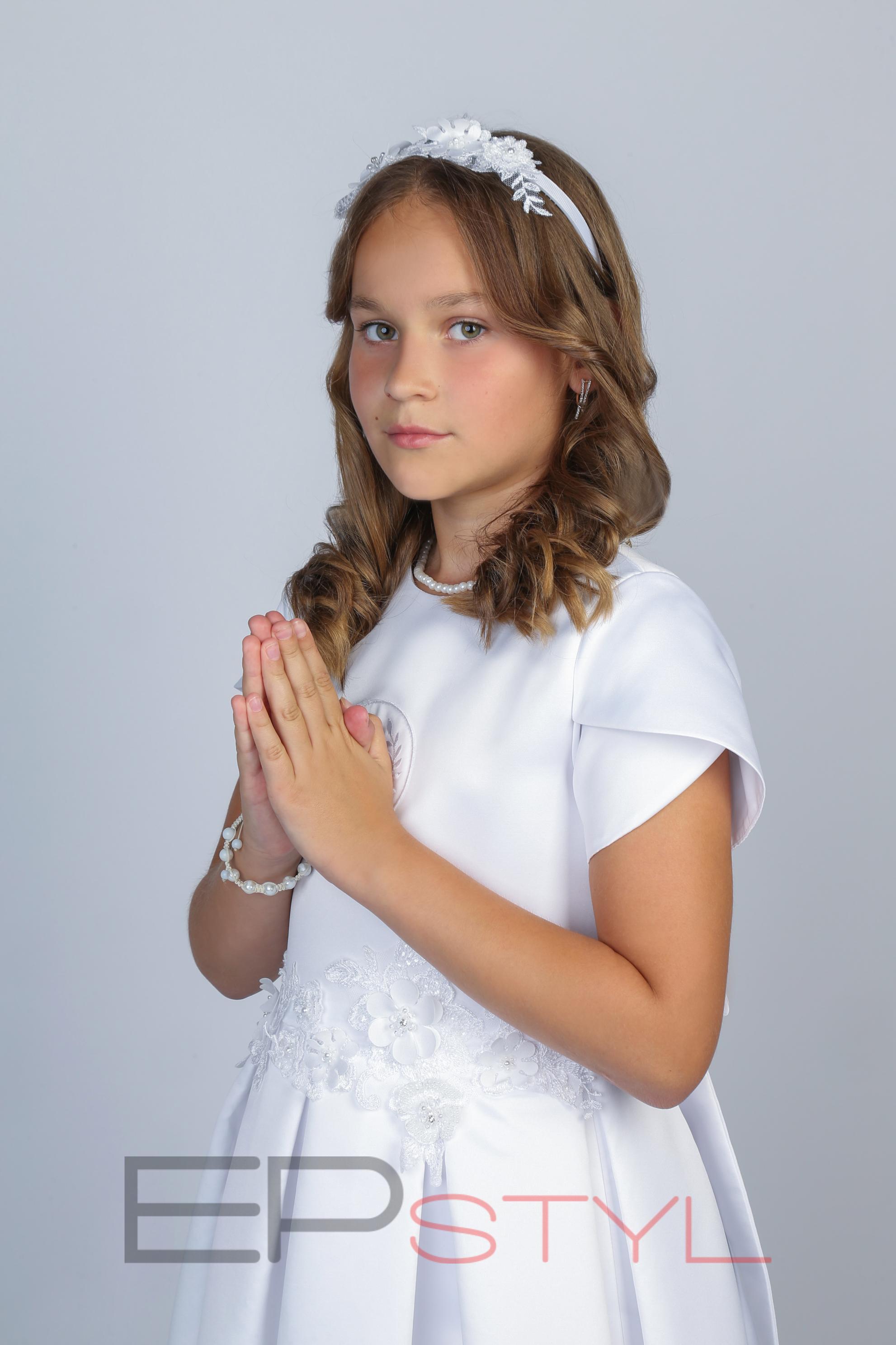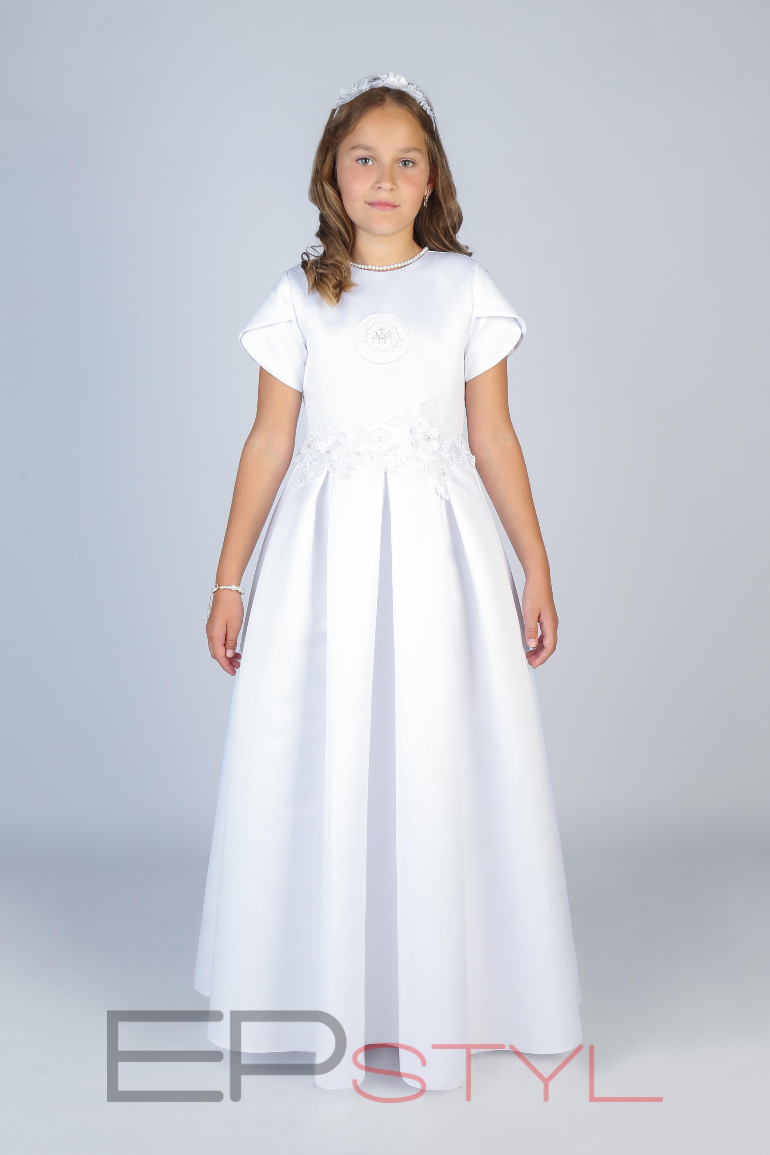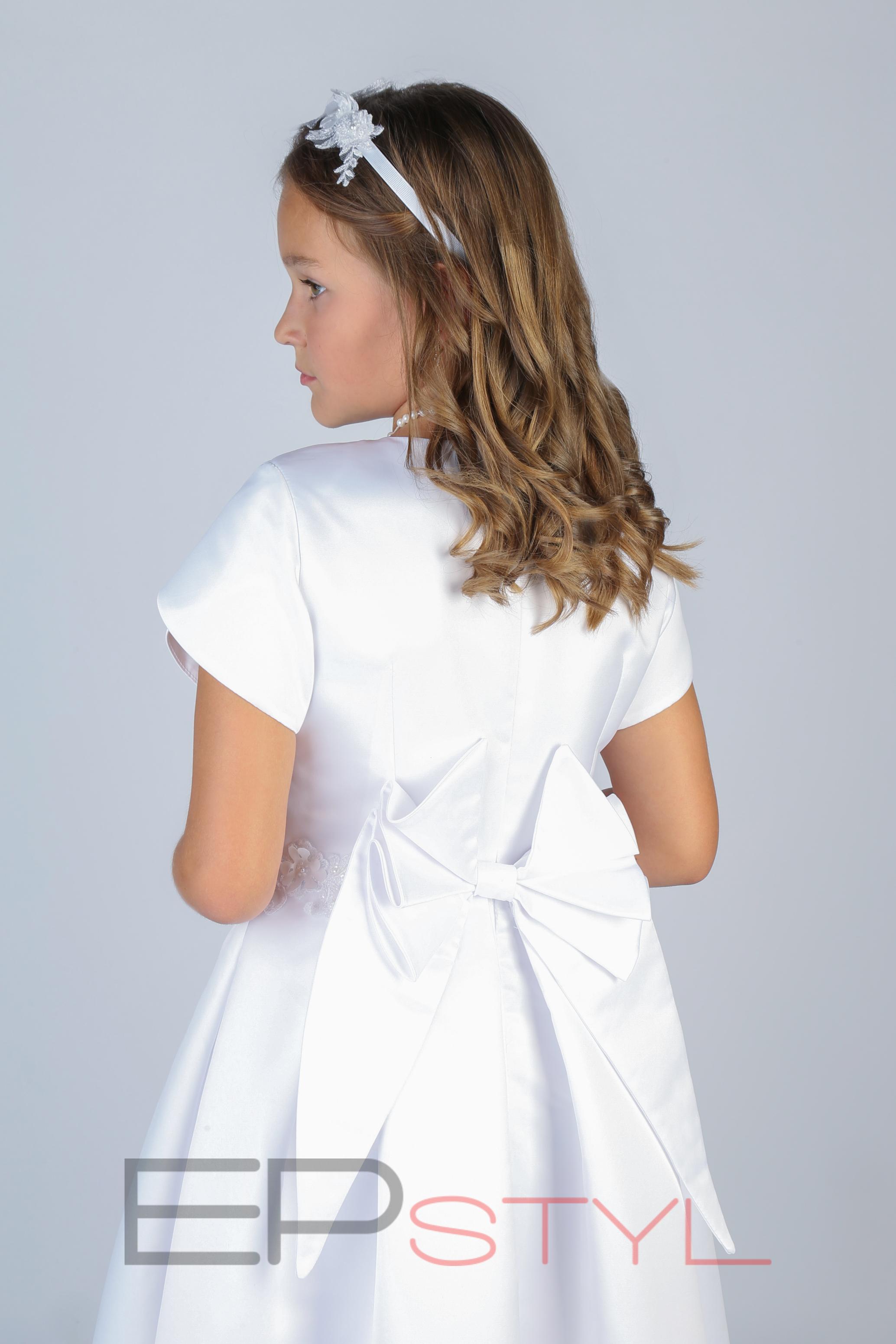 Elegancka sukienka wykonana z matowej satyny, dopasowana góra z dekoltem w łódkę, szeroki dół układany w kontrafałdy. W talii ozdobna kwiatową aplikacją 3D i układaną kokardą z tyłu.