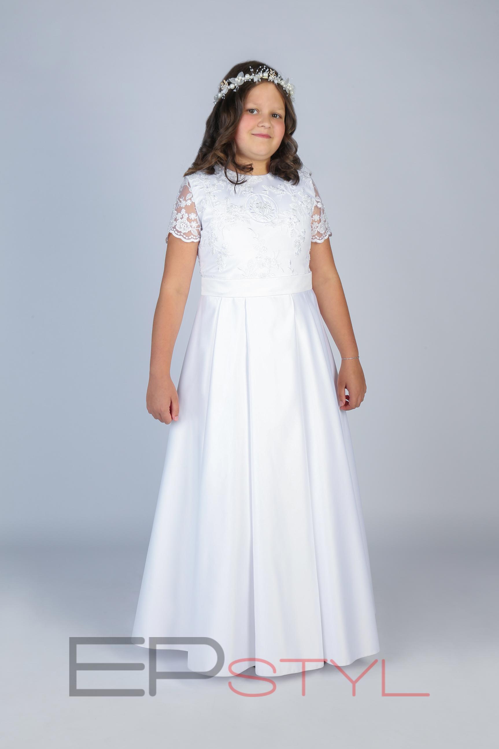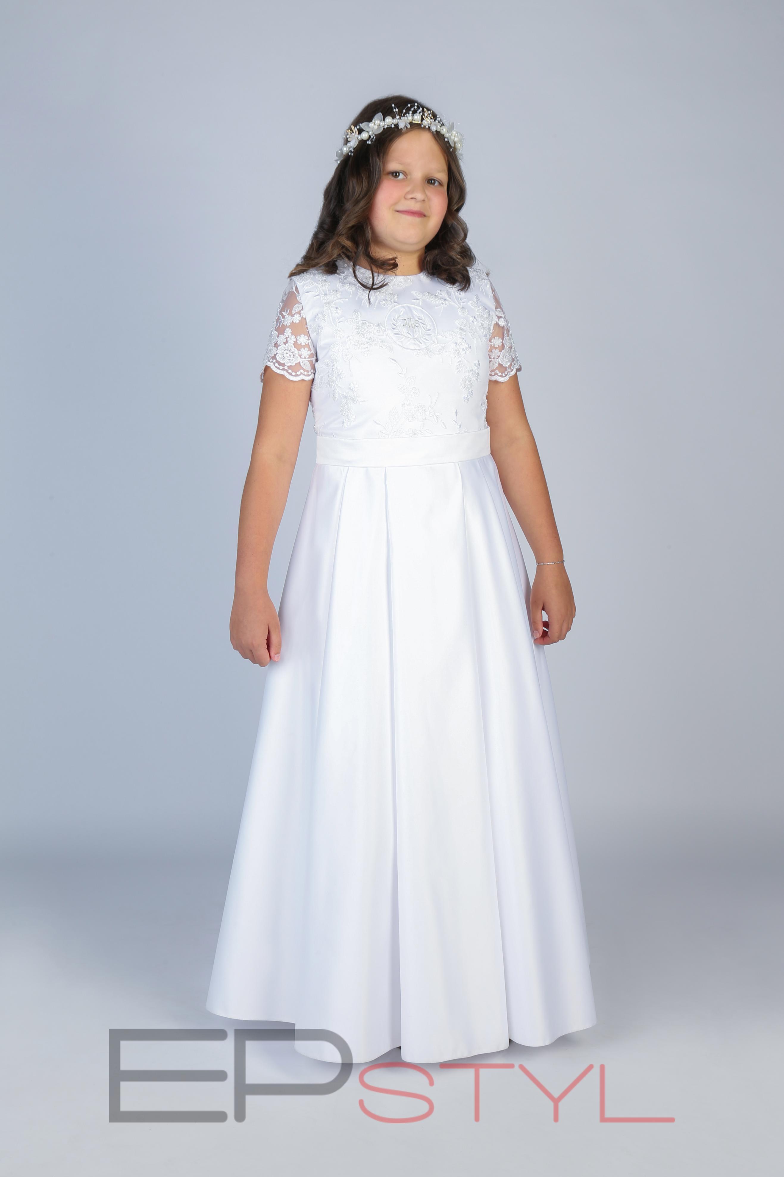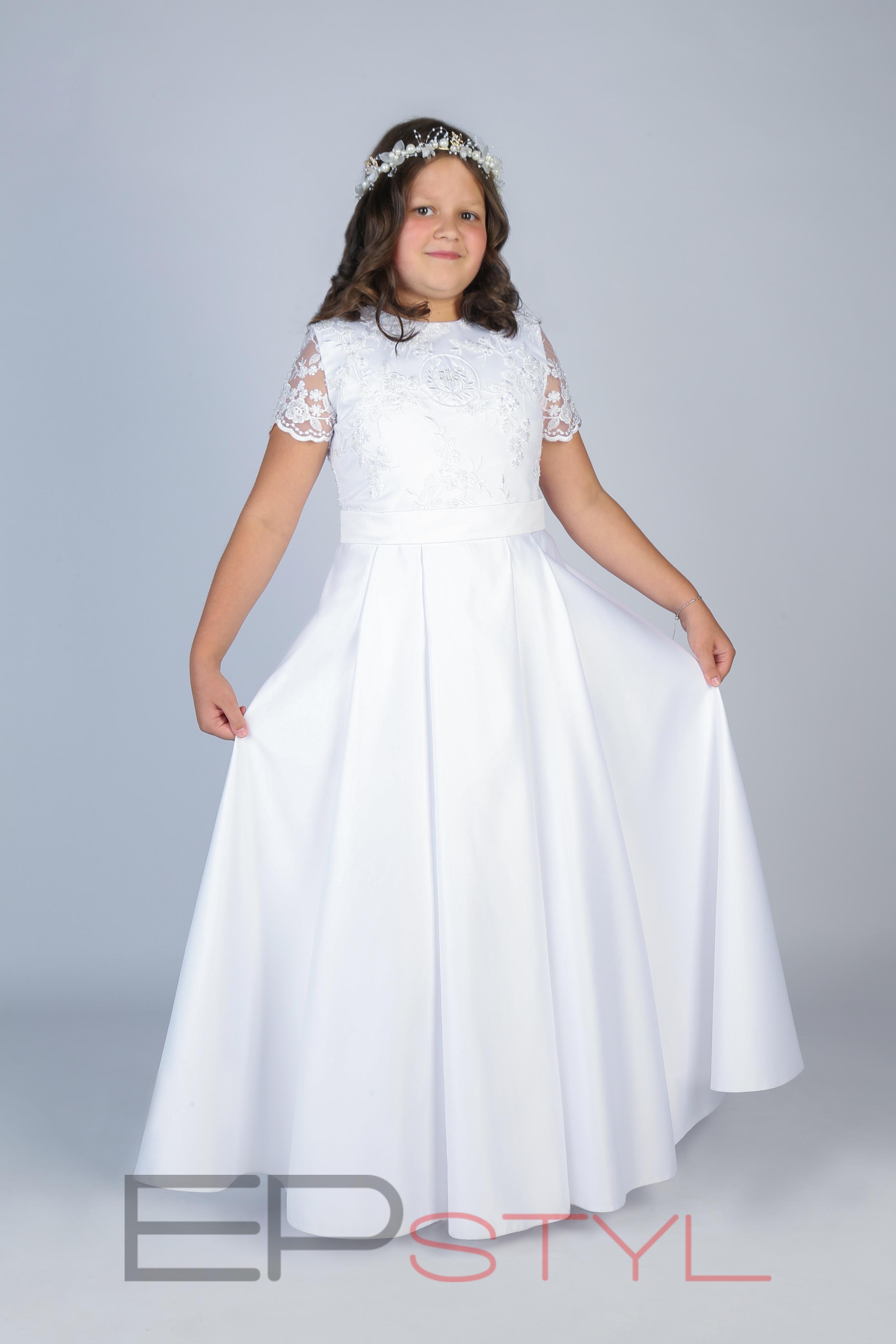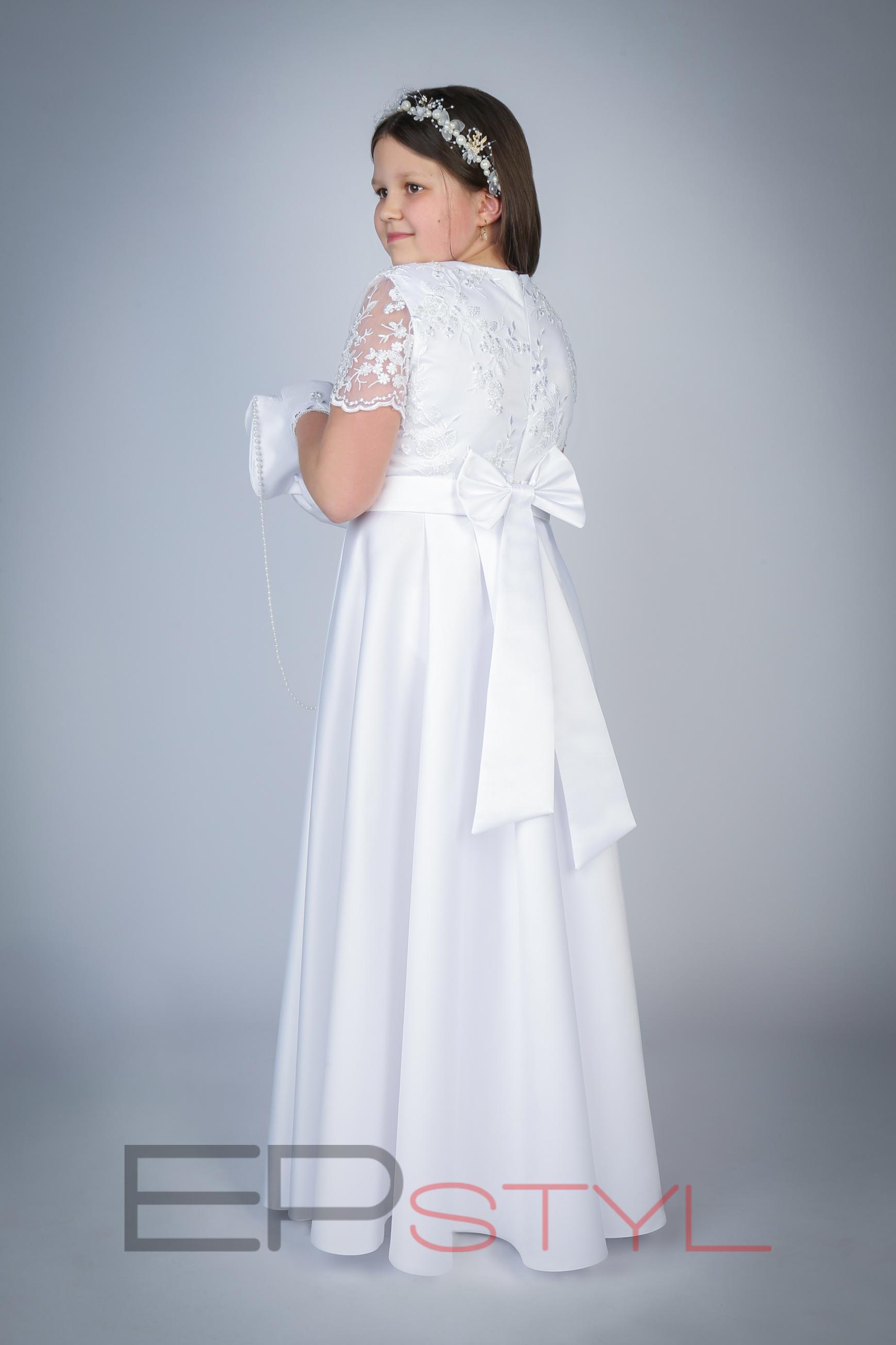 Bogato zdobiona sukienka wykonana z satyny, koronki.