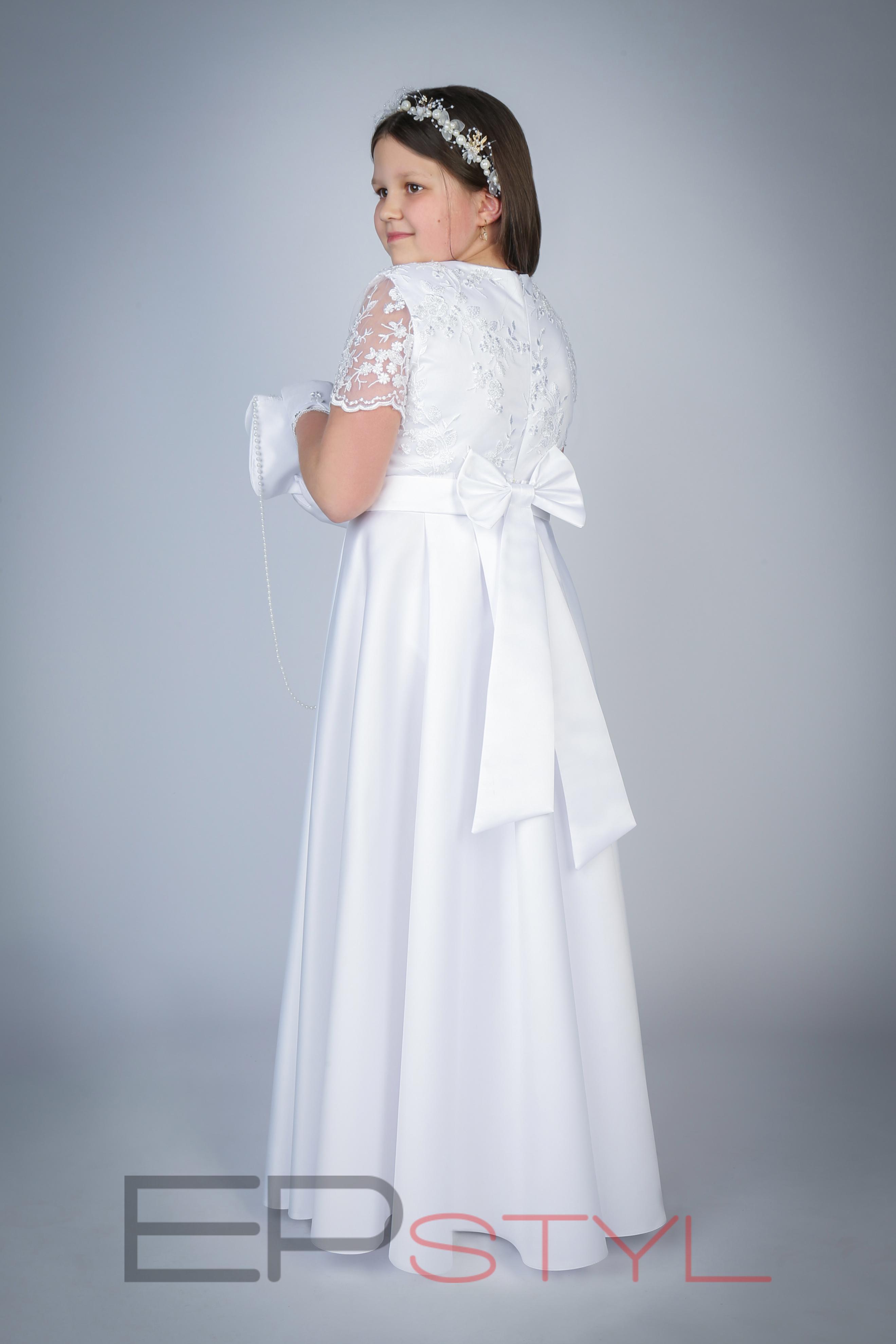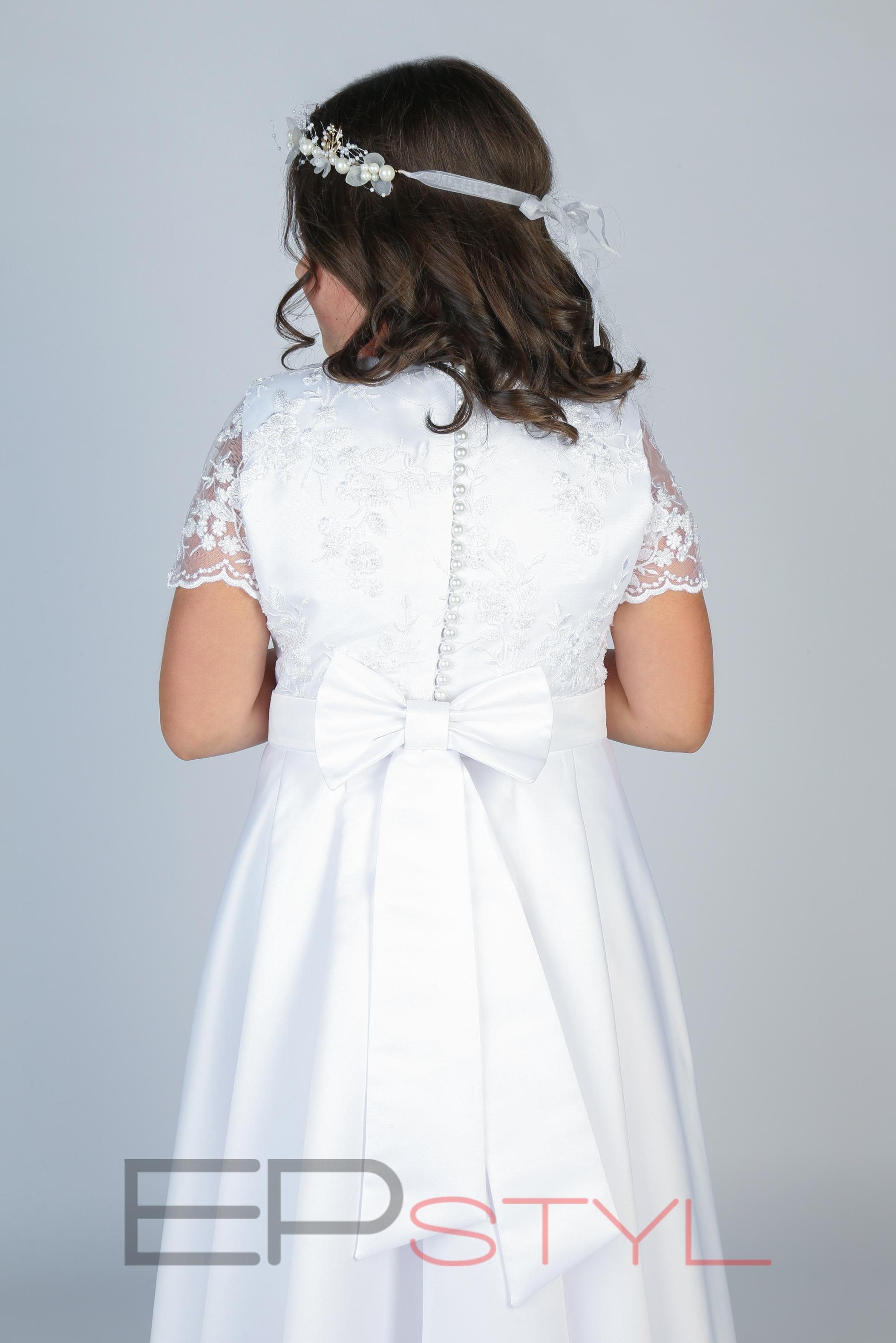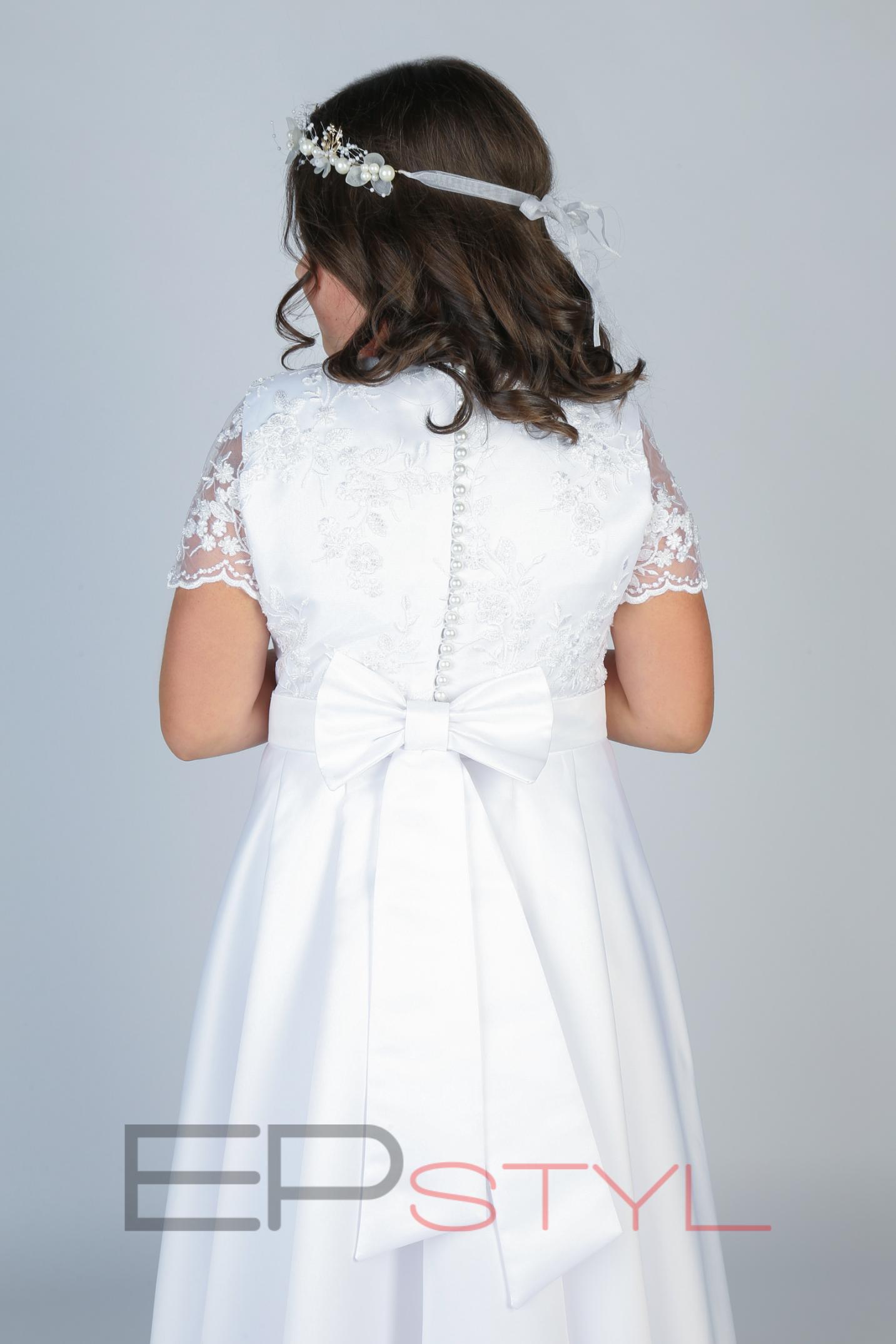 Koronkowa kwiatowa góra wyszywana jest koralikami i perełkami z przeźroczystym rękawkiem. Dół sukienki zakładany jest w fałdy, w talii pasek wykończony kokardą z szarfami.